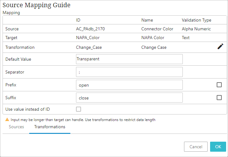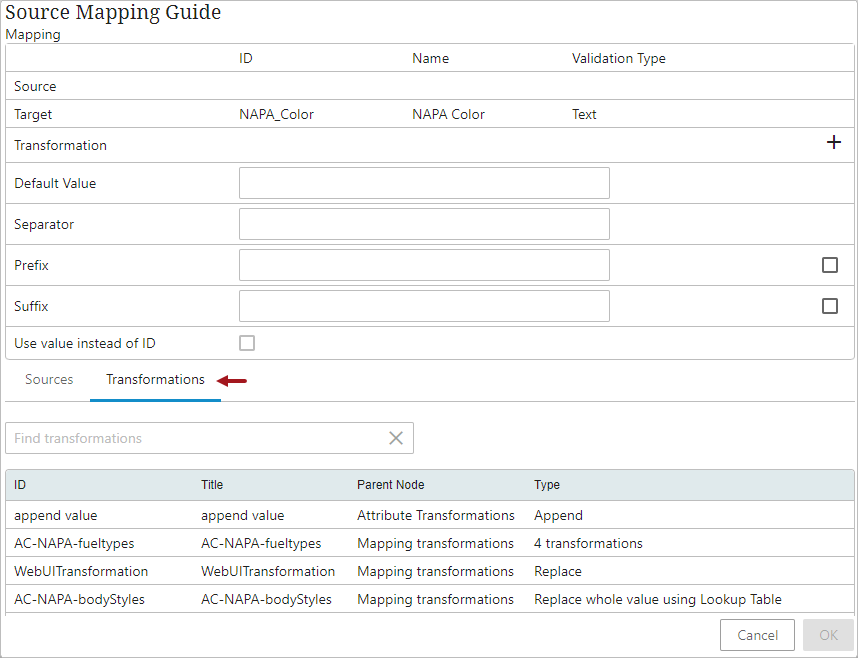 ) available within the Transformation field will open the Transformation Overview window where the user can create a new attribute transformation. For details about creating an attribute transformation standing on a Mapping Guide window, refer to Creating Attribute Transformations Through Mapping Guide Window topic.The populated transformation can be edited / removed by clicking the edit icon (