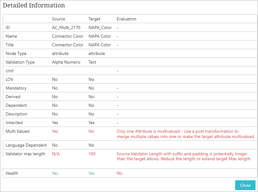 After the source and target attributes are defined in the Source Mapping Guide window, the system evaluates the validity match between the source and the target attributes. A hyperlink text explaining the reason for the validity match / mismatch gets displayed in the middle of the window. Clicking on the hyperlink opens the 'Detailed Information' dialog (shown below) and displays the validity match / mismatch information of the mapper. Below is an example of a validation mismatch between the source and the target attribute displayed in the 'Detailed Information' dialog:
