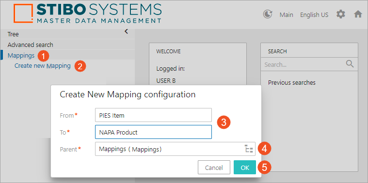 - Click on the 'Create new Mapping' link, and the 'Create New Mapping configuration' dialog displays.