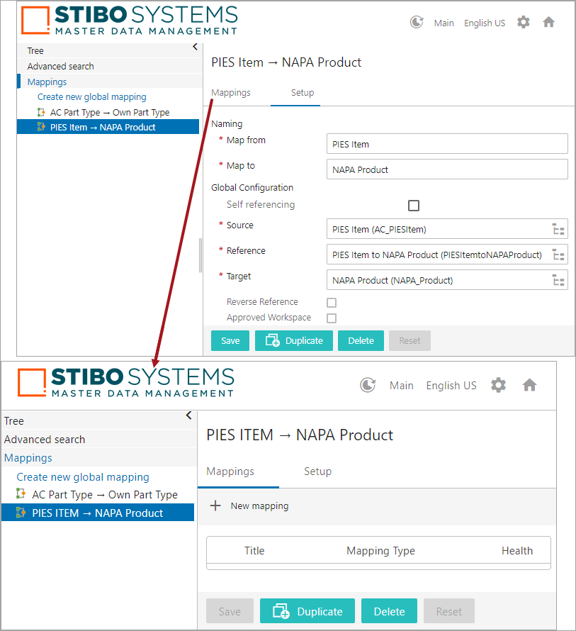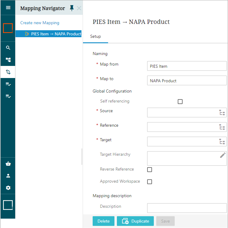 - Click OK, and the new mapper configuration named 'PIES Item → NAPA Product' is created under setup group 'Mappings' in the Global Navigation Panel (as shown below). Also in the image below, a Unicode arrow → is created between the Source and the Target names demonstrating the direction of the intended mapping.