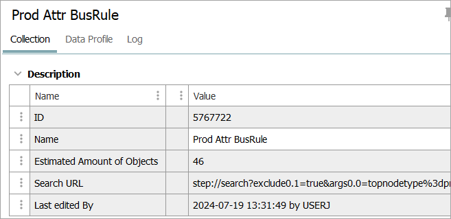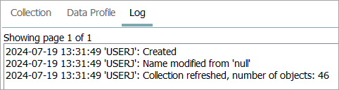 The Log displays details about the creation and modification of the collection, details about which user performed what actions, and the number of objects in a collection when a collection is refreshed. For more information, refer to the Log Tab for Objects topic.