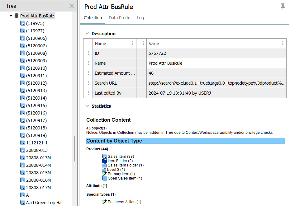 Note: While viewing the collection in Tree it may appear that there are fewer objects in the collection then what is reported by the Estimated Amount of Objects field under the Description section or the total objects reported under the Statistics section. This happens when objects are not approved for the current workspace and therefore do not show or due to privileges.