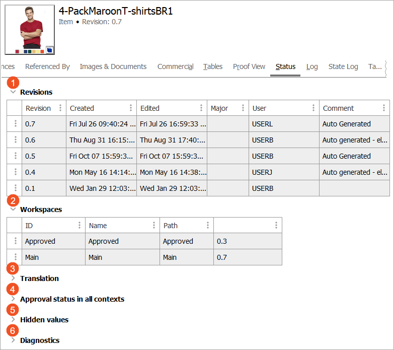 - Workspaces: All the workspaces that the selected products are in will display, as well as the revision number that exists in that workspace. Generally speaking, if the object has been edited since it was approved, the Main and Approved workspaces will hold different revisions. However, it should be noted that not all changes to an object generate a revision. More information on this is available in the Revisions topic in the System Setup documentation. For more information on workspaces in general, refer to the Workspaces topic in the System Setup documentation.