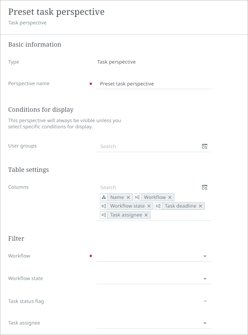 Name the Tasks perspective and select a workflow. If the Tasks perspective is designed for users who will only need to view a single workflow state, also select a workflow state. If the perspective is designed for a user that needs to view all states in the workflow, leave the 'Workflow state' field blank.
