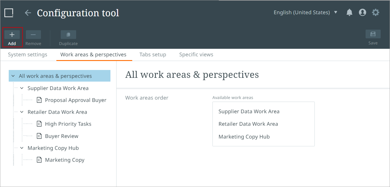 To create a new work area, click the 'Work areas & perspectives' tab on the Configuration tool homepage.