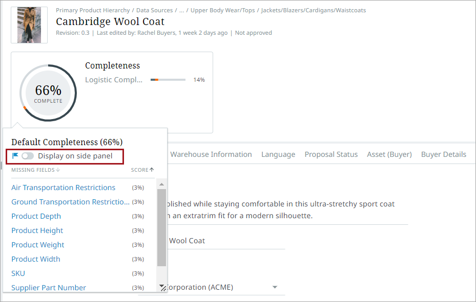 Additionally, when the 'Display on side panel' toggle is engaged, a circle icon will display to the right of the tab label for the tab that contains attributes that are missing values that contribute to the item's configured Completeness.