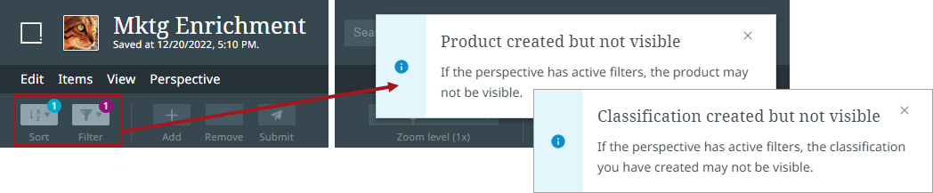 If the newly created object cannot be viewed in the current perspective, then a notification displays. For example, if the Browse perspective data set is filtered and the filtering is not applicable to the new product or classification, the screen will not automatically navigate to the new object but will provide information on why a detailed view cannot be shown.