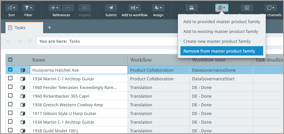 Remove from master product family - This action removes the selected product(s) from their master product family.