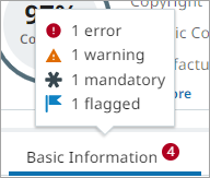 Issues on an item will also be denoted on the tab label itself. For any issues found for a tab in the details pane, a circle with the consolidated number of all data issues be displayed to the right of the tab label and the color of the circle reflects the issue with highest severity. In the image below, the red circle with the number 4 indicates that four validation issues exist and at least one is an error. Hovering over the tab will display a summary of the number of issues per issue type.