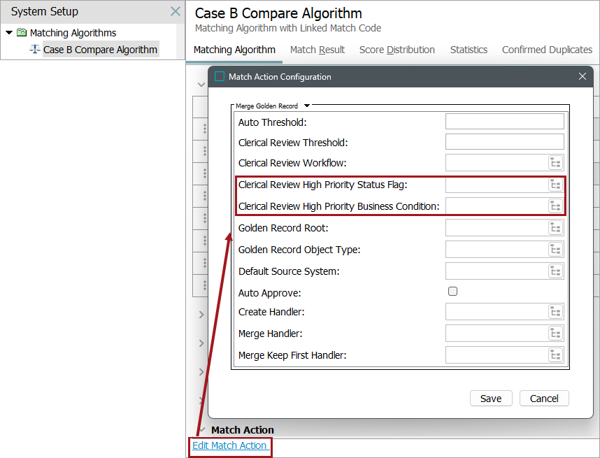 The high priority business logic can be added inside the Match Action configuration of the matching algorithm. To assign the 'Clerical Review High Priority Status Flag' and the 'Clerical Review High Priority Business Condition':