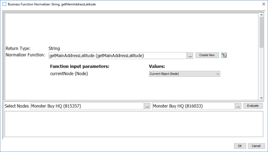 The business function returns a number of match codes, and therefore has the return type List<String> and the input parameters are the latitude and longitude of the main address.