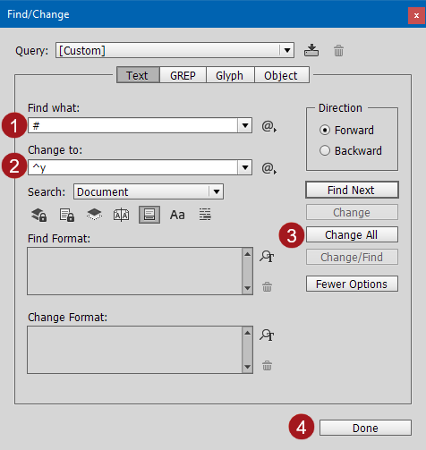 - Type # in the 'Find what' field and ^y in the 'Change to' field. ^y is the InDesign character for Right Indent Tab.