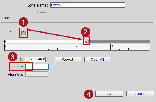 - Enter a period in the Leader field (3 in the above screenshot). Click OK (4).