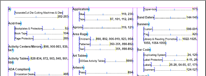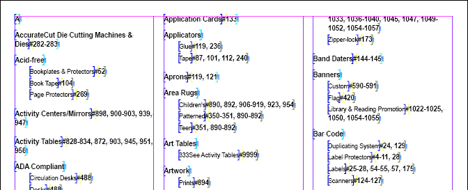 The typical desired end result for a mounted index is to have what is known as dot leaders to separate the index words from their corresponding page numbers. For example: