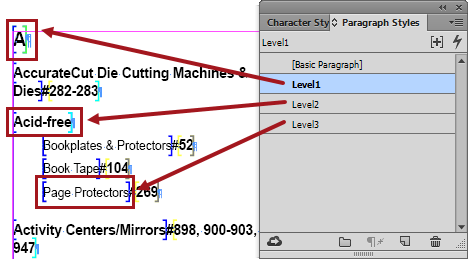 The index mounting page must also have InDesign paragraph styles and character styles configured to properly format the different levels of the index.