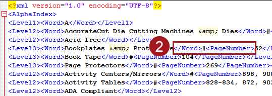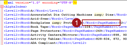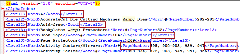 In the index XML, these levels have corresponding tags. Level1 corresponds to the <Level1> tag, PageNumber corresponds to the <PageNumber> tag, and so forth.