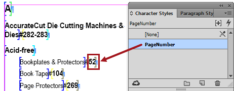 Page numbers are frequently mounted using a character style, as it is common for the page number to be a different style than the index word immediately preceding it. In the below instance, the 'Level3' paragraph style is used to format the index word ('Bookplates & Protectors') and the character style 'PageNumber' is used to override the Level3 paragraph style with a 9 pt bold font for the page number.