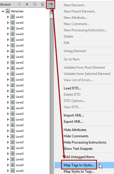 - Click the Options menu in the upper right corner of the InDesign XML structure panel, then click Map Tags to Styles.