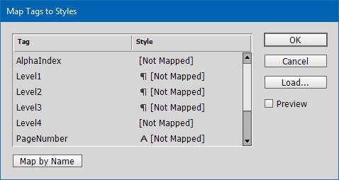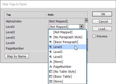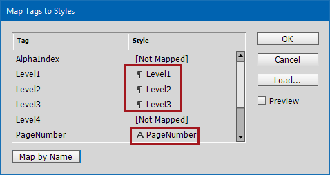 - If your style names are identical to the tag names, click Map By Name to automatically map the tags to the styles. Click OK.