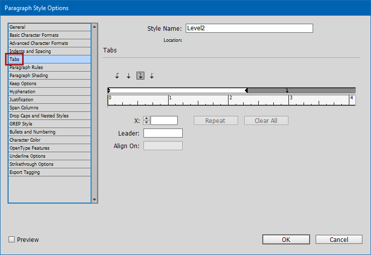 - On the Paragraph Style Options dialog, click on Tabs in the left column.