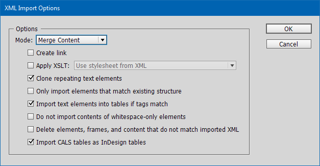 - Click OK on the XML Import Options dialog that displays. All settings can be left as-is.