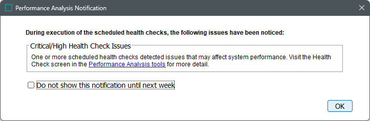 If any of the scheduled health checks detect an issue that has either a critical or high severity, the schedule has been disabled, or there is not enough time to complete all scheduled health checks within the execution window, users who have the View Administration privilege will view a popup upon opening the workbench. This alert allows the user to review the issue(s) in the Performance Analysis tools.