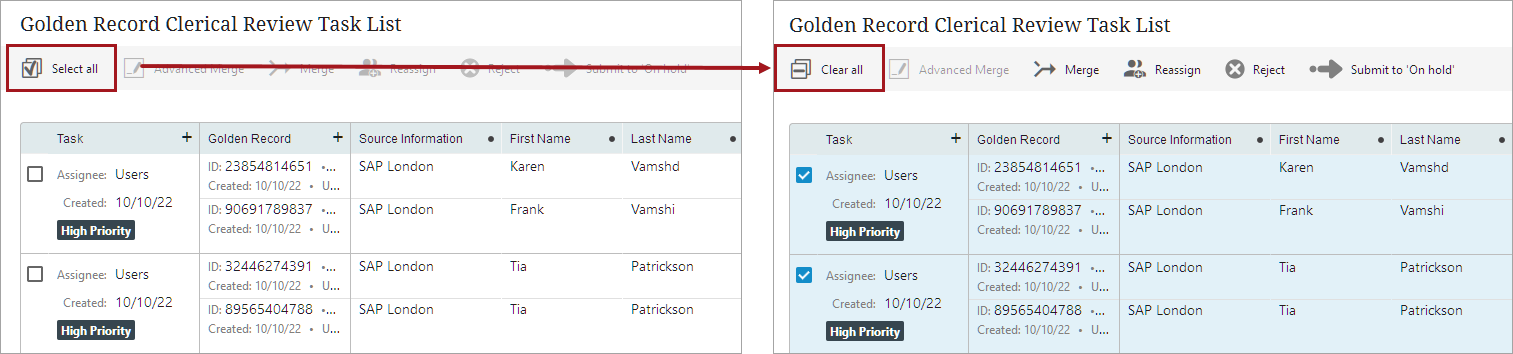 In the Clerical Review Task List, a 'Select all' button that operates on all tasks in the list (respecting any filters applied) has been added. Additionally, when using the merge, reject, reassign, or submit action on 10 or more selected tasks, the operation will now run as a background process (BGP), giving users the ability to continue working in the user interface even while the operation is running.