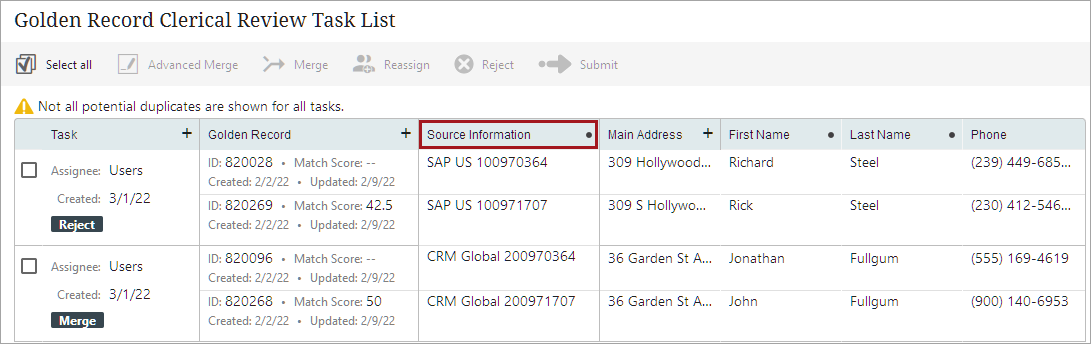 Previously, the Source Information Header in a Golden Record Clerical Review Task List only showed the source system that a record originated from prior to being initiated into STEP. Now, the Source Information Header enables the data steward to filter the Task List by the source record information based on the value of the source record ID or the name of the source system itself. Furthermore, each row in this header will contain both the source system name and the source record ID.
