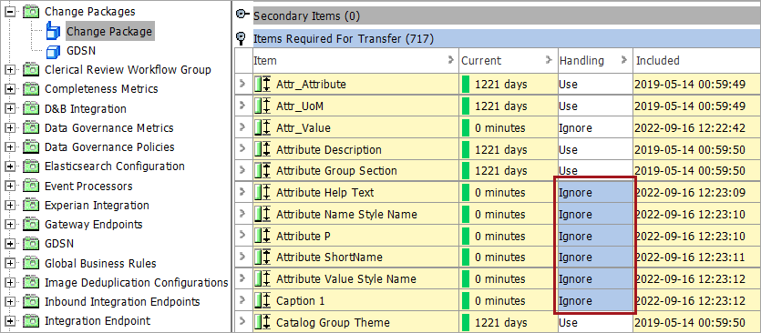 Within a Change Package, the Handling column gets populated with the 'Use' setting. Now, as required, users can copy an 'Ignore' setting and paste it into multiple cells. Previously, if a user needed to ignore multiple attributes, the 'Ignore' option was manually selected from the dropdown menu for each attribute.