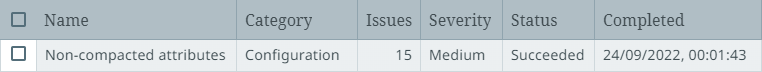 The configuration healthcheck 'Non-compacted attributes' identifies non-LOV attribute values that do not use Compact Value Storage (CVS) on Oracle-based systems. CVS requires less storage space and improves the system response time. An administrator can review the attributes reported by this check and convert them to CVS or to LOVs, as appropriate.