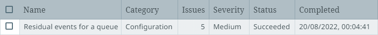 The configuration healthcheck 'Residual events for a queue' reports event processors, outbound integration endpoints, and event queues that have generated events that have not been processed within a week. The identified processors are set to 'read' events but are either not enabled, are stopped in an error state, or are enabled but not scheduled. An administrator can inspect the objects in the report and change the configuration to either consume the events or discard them.
