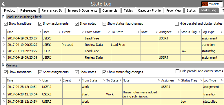 Logs for workflow transitions, also referred to as 'State Flow Logs' or 'State Logs', are displayed in the 'State Log' tab of a product, entity, and classification editor in the workbench. This tab includes a complete history of transitions, notes, assignments, and status flag changes for the object. Over time, the number and size of such log entries can result in poor STEP performance and can also hinder migration to SaaS due to the required storage.