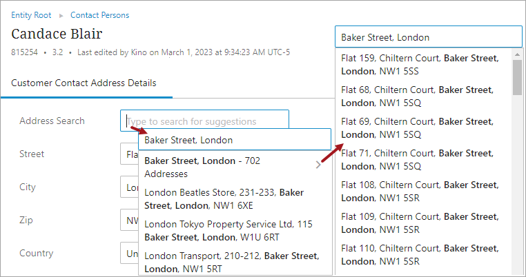 A subscription with an address search service and a one-time configuration in STEP results in the address search functionality displaying for selected address attributes identified in the Address Component Model. Typing at least two characters of an address retrieves the top 10 potential matches from the external service. The user can select a general address from the dropdown menu that displays, or can click the arrow (>) next to a dropdown menu item to select from an extended list of specific house number addresses.