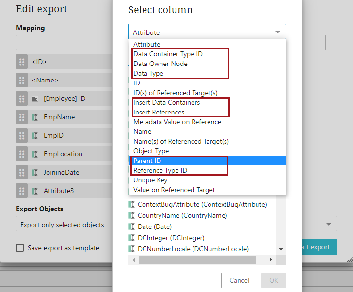 With this release, the Web UI now enables end users to easily export complex data without the need for export configurations. Users can now select from seven new headers when mapping columns in the Custom Export component. The new headers are: