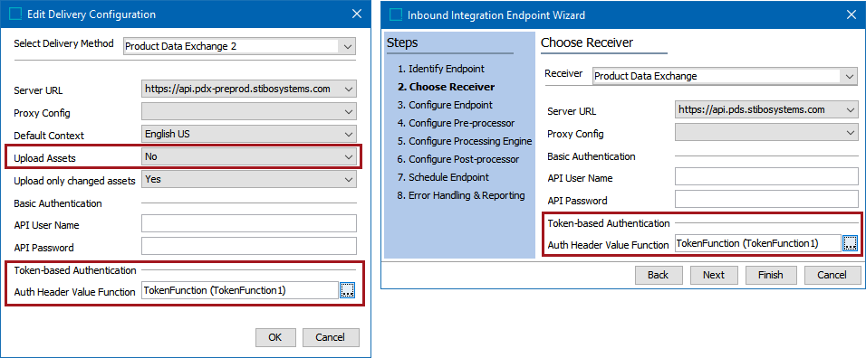 The PDX integration now allows use of the OAuth 2.0 token-based authorization protocol via the 'Product Data Exchange 2' delivery method in outbound integration endpoints (OIEPs) and the 'Product Data Exchange' receiver in inbound integration endpoints (IIEPs). Configuration parameters in both OIEPs and IIEPs now provide users with the option to use either 'Token-based Authentication' (with a business function providing an Auth-Header Value Function) or the existing 'Basic Authentication' (with API user name and password) options.