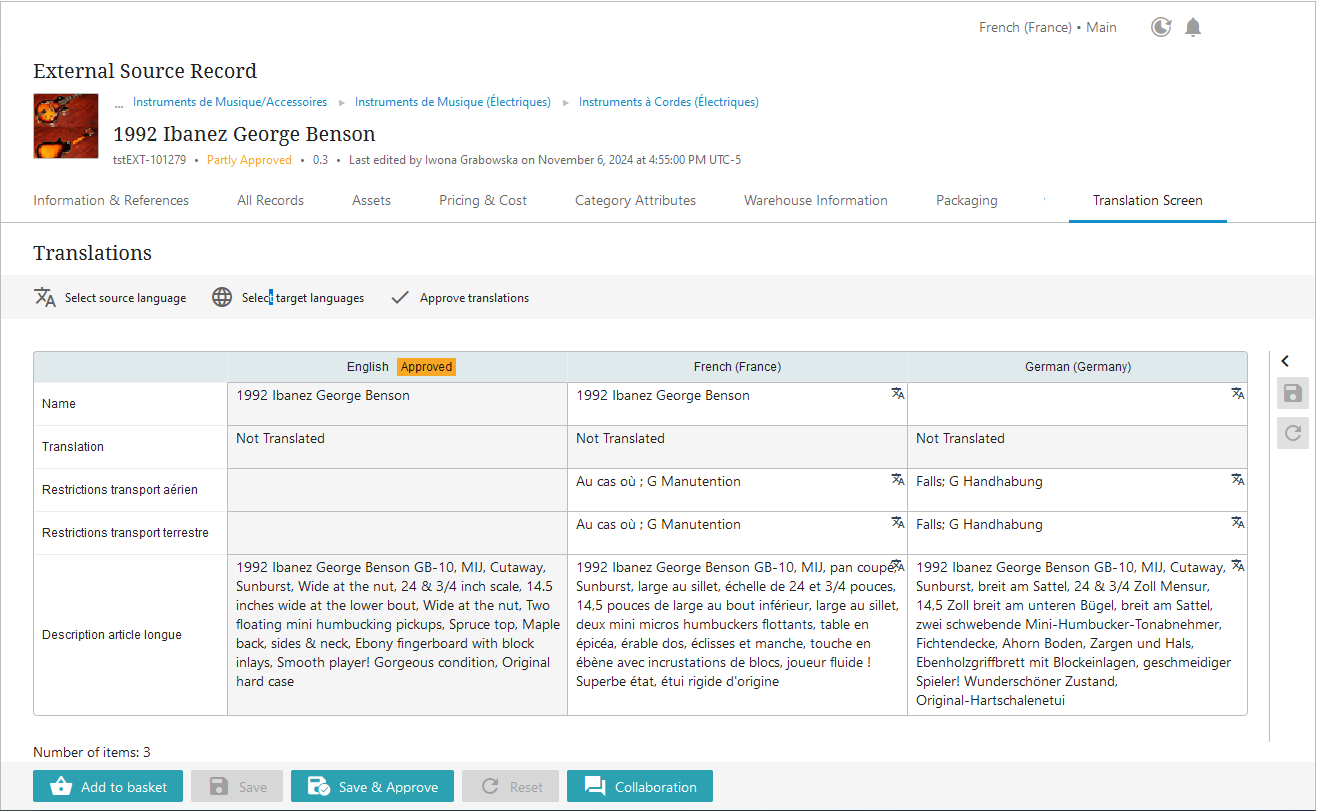 In a significant update to the Web UI's translation capabilities, the new Translation Screen has been made available to allow business users to view language-dependent attribute values in all configured target languages and compare them to those in the approved source language. This powerful addition to the Web UI's translation offerings enables users to more easily monitor and manage data translation without leaving the Web UI.