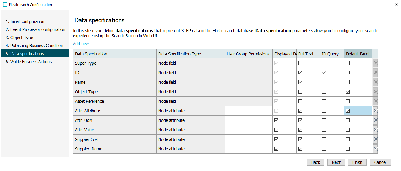 The Instrument search screen can now be configured to only display filters relevant to the search results. To determine which filters can be applied, specify the relevant nodes as 'Default Facet' in the Data specifications step of the Elasticsearch configuration.