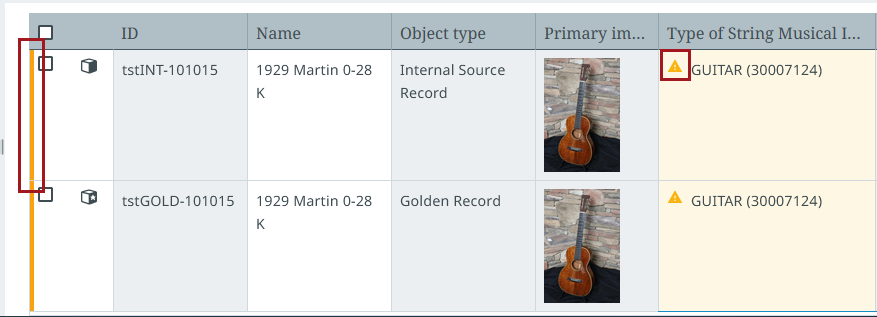 In the list view, an orphan attribute displays with a warning indicator beside the attribute value, as well as with a row indicator displaying vertically at the beginning of an affected row, as shown below: