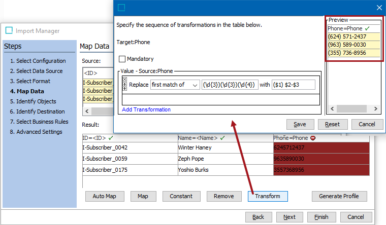 - Transformation: Replace first match of (\d{3})(\d{3})(\d{4}) with ($1) $2-$3