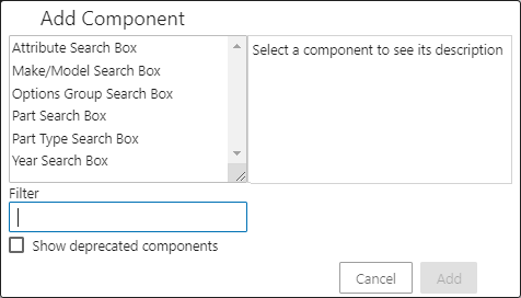- From the Vehicle Type Search Panel Properties dialog, click the Add button below the Search Box Types parameter field, and the Add Component dialog will display.