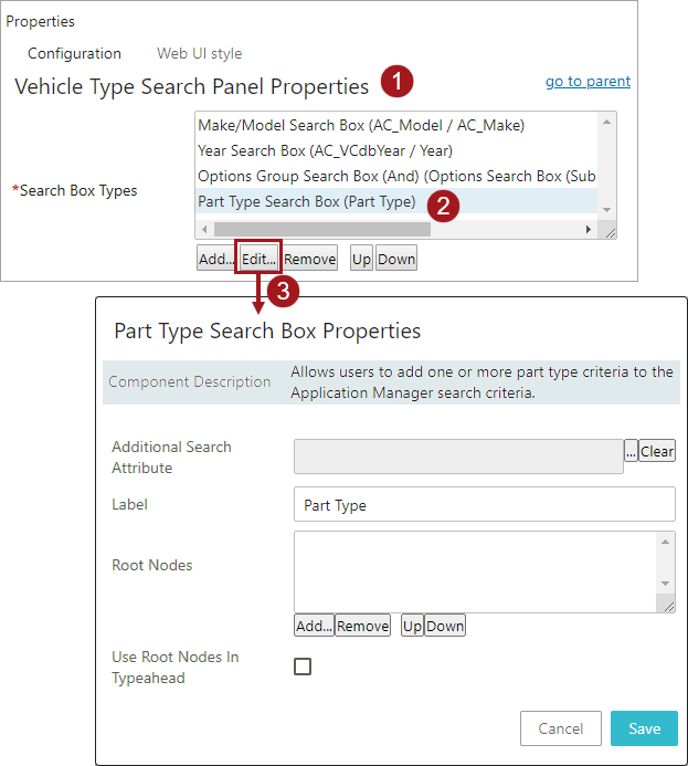 - Click the Add button, and the Vehicle Type Search Panel Properties will display with the Part Type Search Box added to the Search Box Types parameter.