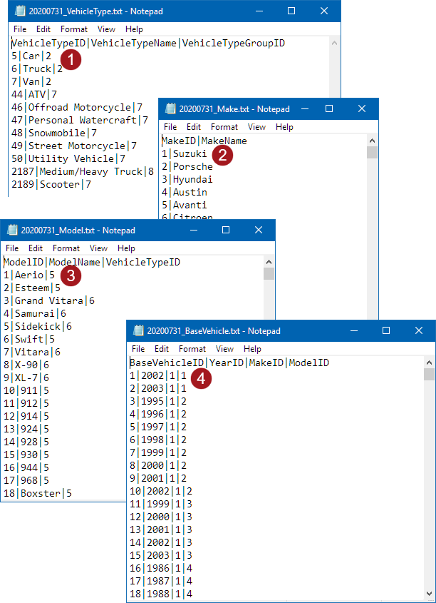 - The sample text files below shows how the 'Make.txt,' 'Model.txt,' 'BaseVehicle.txt,' and 'VehicleType.txt' files are present in the VCdb file folder, and the screenshot below shows how the Vehicle Type (1), Make (2), Model (3) , and the Base Vehicle (4) objects are populated in the system.