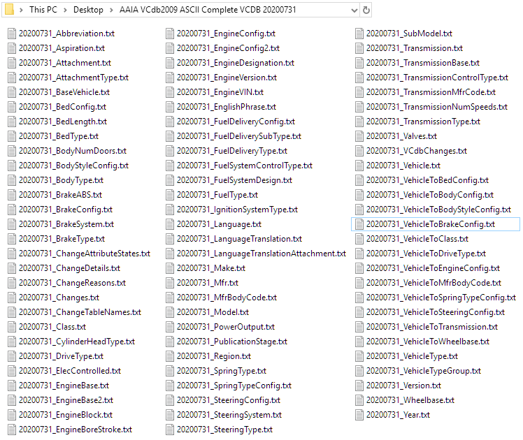 Auto Care will provide new VCdb files at the end of each month to be available for Auto Care subscribers to download. In the Auto Care VIP portal, when the selecting ASCII file type to download, a .zip file will be generated with the file naming such as 'AAIA VCdb2009 ASCII Complete VCDB 20200828.zip' or 'Auto Care VCDB ASCII Equipment 20200828.zip.'