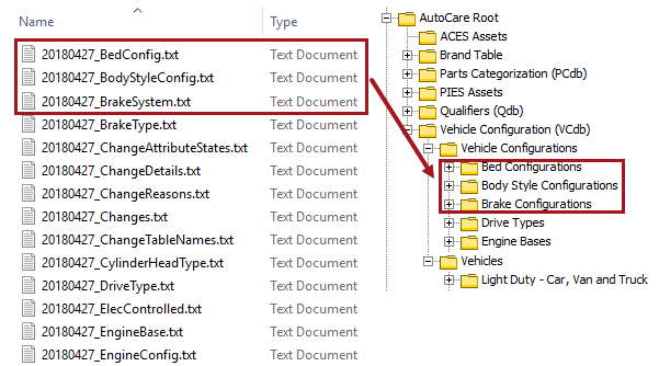 All of the information present in the VCdb file is modeled to be listed under the 'Vehicle Configuration (VCdb)' classification folder. The files 'BedConfig.txt,' 'BodyStyleConfig,' and 'BodyStyleConfiguration.txt,' and a screenshot of showing how it is populated in STEP is displayed below.