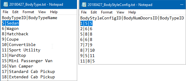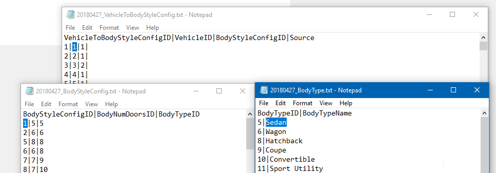 - Sample files 'VehicleToBodyStyleConfig.txt,' 'BodyStyleConfig.txt,'and 'BodyType.txt,' and a screenshot of showing how the information present in it is populated in STEP is displayed below.