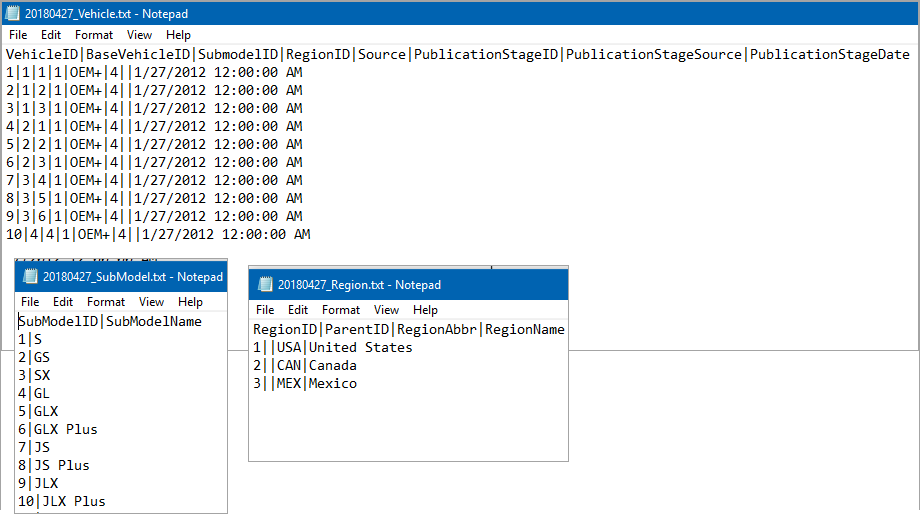 - Sample files 'Vehicle.txt,' 'SubModel.txt,' and 'Region.txt,' and a screenshot of showing how the information present in it is populated in STEP is displayed below.