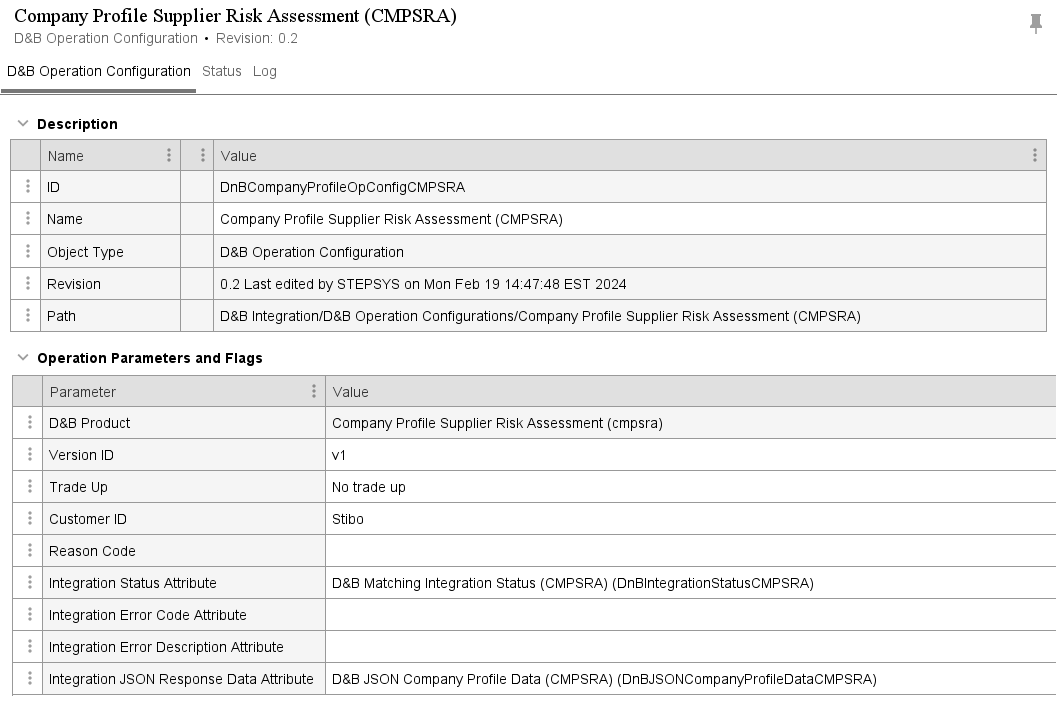 The following example illustrates how to configure STEP to integrate with Company Profile Supplier Risk Assessment (CMPSRA). This leverages the default data mappings deployed by ‘Easy Set-up.'