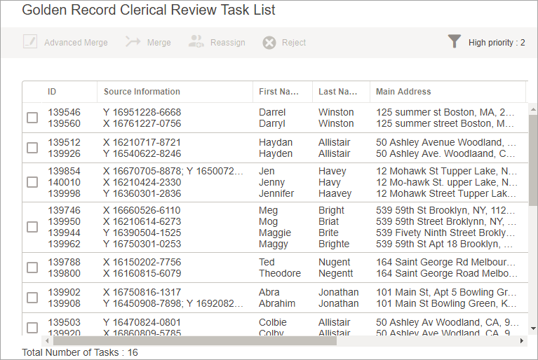 To assist data stewards in identifying critical issues, Clerical Review task lists can be filtered to display only high priority tasks. To flag tasks as high priority, a workflow status flag and accompanying business condition must be configured on the relevant matching algorithm.