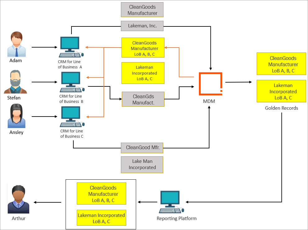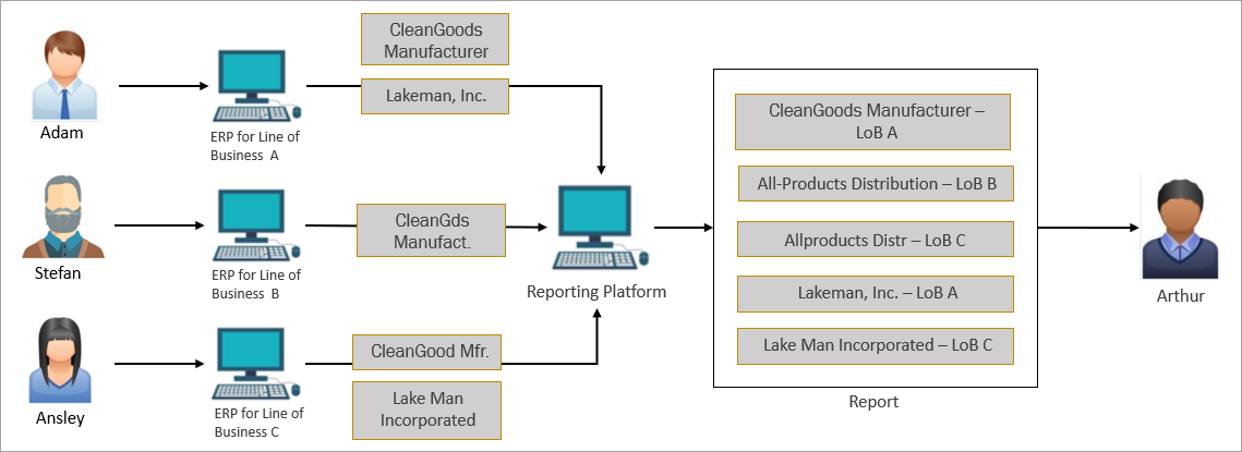 With multiple points of data entry in this process, supplier data is prone to duplicates across ERPs as well as incomplete and conflicting information being introduced. Furthermore, although data is synchronized from each ERP application to ACME’s reporting platform, there is no reliable process for aggregating customer data. Arthur cannot conduct validity checks and other governance measures required by the business; therefore, the reports that they compile and provide for downstream business operations are prone to inaccuracies.