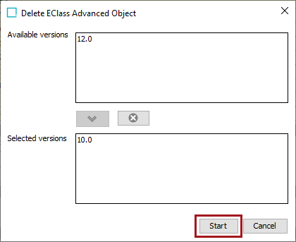 After the desired version is being populated in the 'Selected versions' field, click the 'Start' button to initiate the deletion process. In the example below, ECLASS Advanced data for version 10.0 is to be deleted.